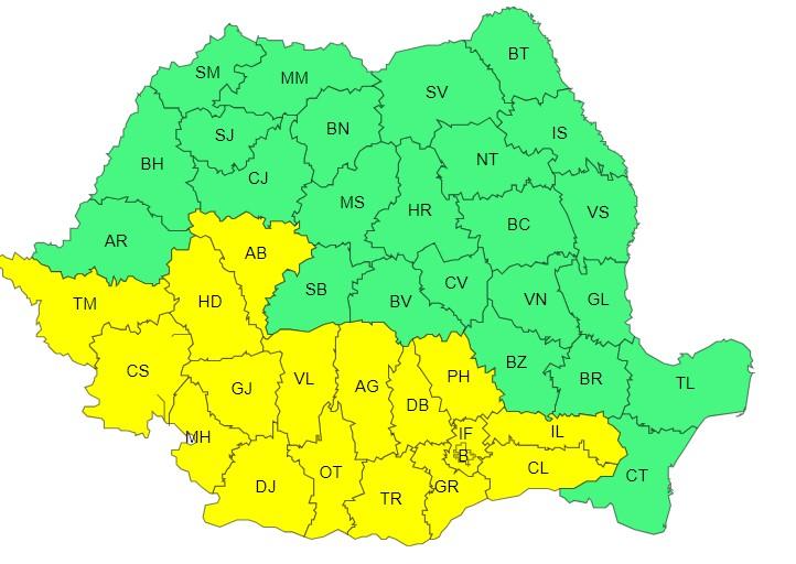 În aceste regiuni se vor înregistra temperaturi ridicate pentru această dată, iar maximele se vor situa în general între 33 și 35 de grade. Local va fi caniculă și disconfort termic ridicat, indicele temperatură-umezeală (ITU) situându-se în jurul valorii de 80 de unități.