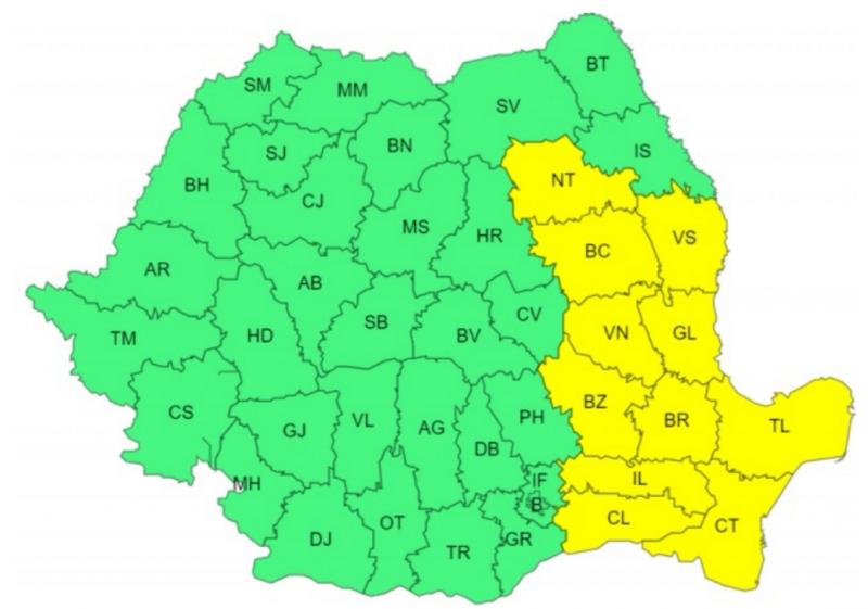 Avertizarea de cod galben de ploi intră în vigoare de la ora 10 şi va fi valabilă până la ora 21. În acest interval vor cădea averse însemnate cantitativ şi vizează zone ca Neamț, Bacău, Vaslui, Galați, Vrancea, Tulcea și Constanța.