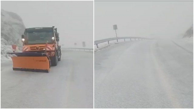 A nins pe Transalpina și s-a depus un strat de zăpadă de aproximativ un centimetru. Drumarii intervin în zonă cu un utilaj și cu material antiderapant.