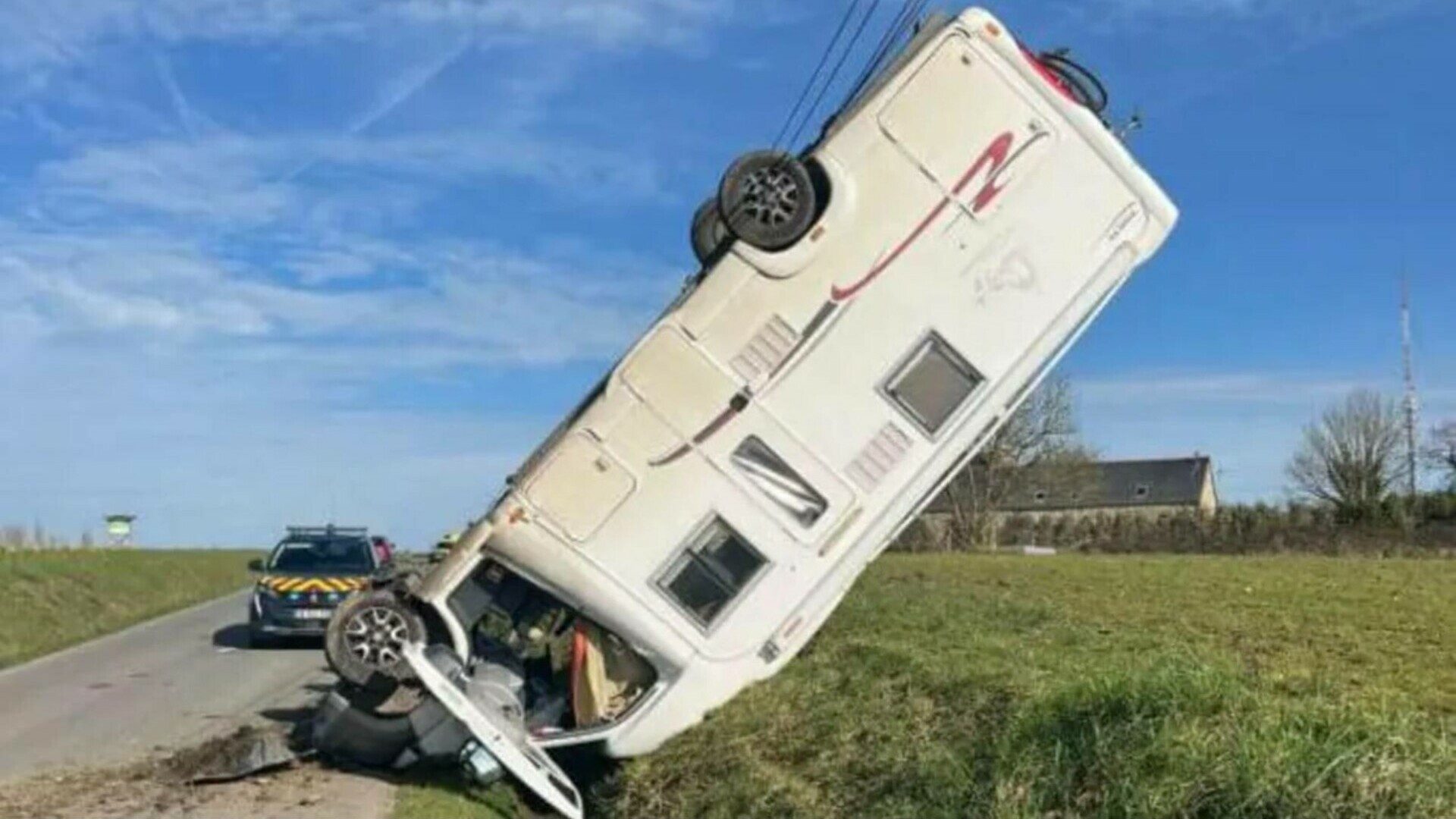 Poliția din vestul Franței investighează modul în care o rulotă a ajuns într-o poziție neobișnuită pe marginea unui drum.
