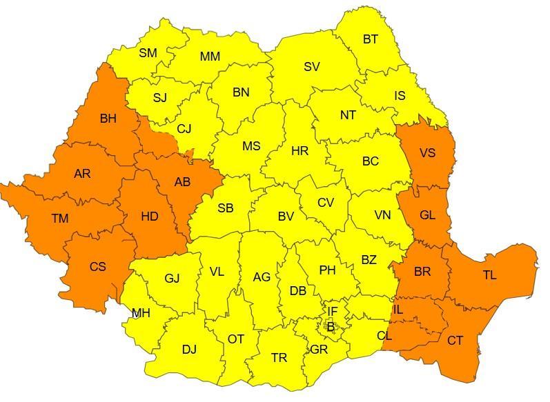 Codul portocaliu va fi în vigoare joi, între orele 10 – 18. În județele Constanța, Tulcea, estul județelor Călărași și Ialomița, Brăila, Galați, Vaslui, Caraș-Severin, Timiș, Arad, Bihor, Hunedoara, Alba și zona montană a județului Cluj vor fi intervale cu intensificări puternice ale vântului. În general rafalele vor fi de 70…85 km/h, iar în zona montană înaltă, de peste 120 km/h. Totodată, în noaptea de joi spre vineri în cea mai mare parte a zonei montane, vântul va continua să prezinte intensificări cu viteze de 70…80 km/h, iar la altitudini de peste 1.700 m vor fi rafale în general de 90…100 km/h.