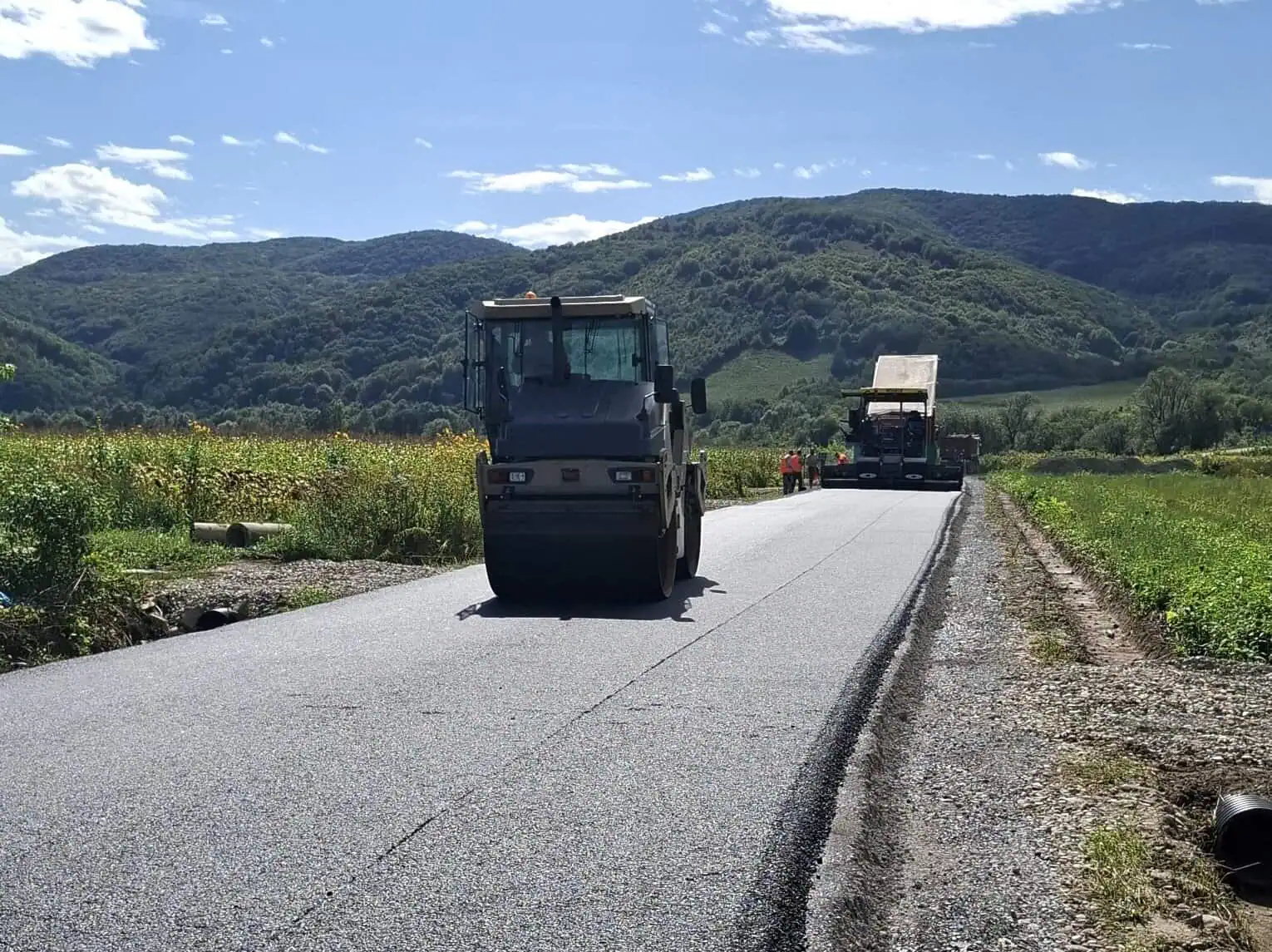 Lucrările de întreținere continuă cu așternerea covorului asfaltic, în timp ce pe restul sectorului de drum se execută stratul suport de balast stabilizat.