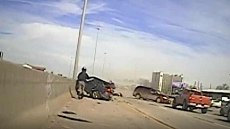 Un accident rutier spectaculos se putea încheia cu o tragedie, pentru un polițist rutier american. Omul legii a scăpat ca prin urechile acului de la moarte.