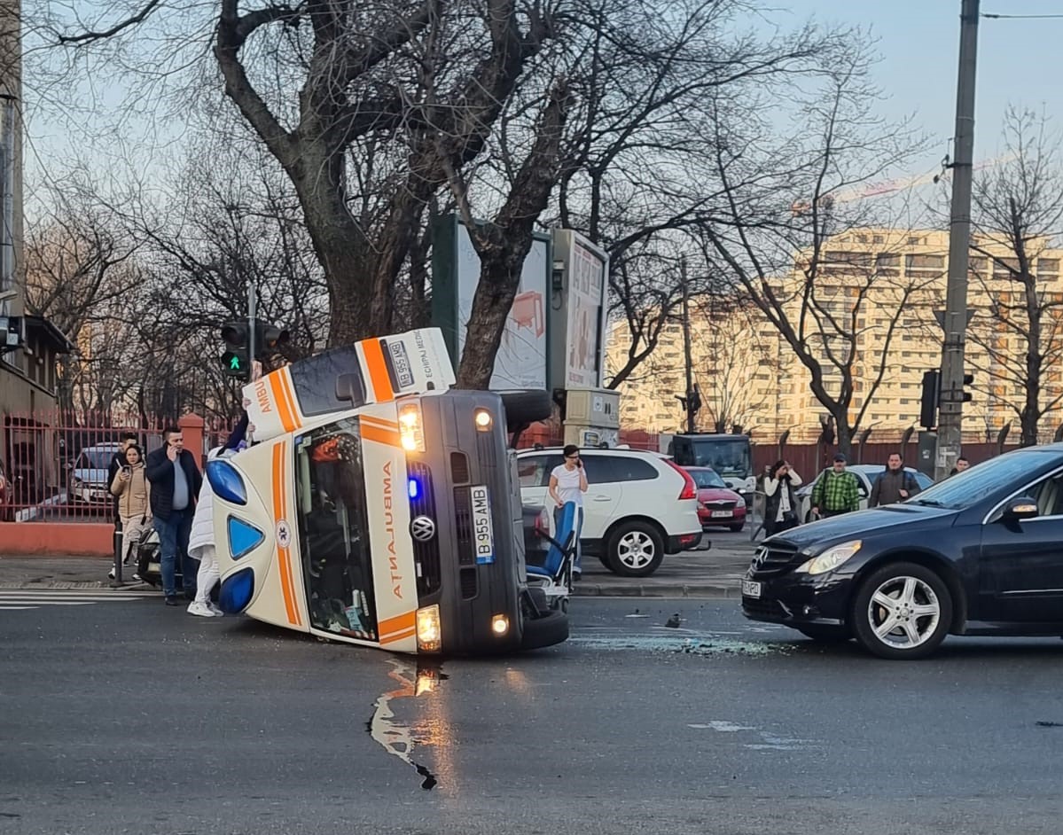 O ambulanță privată, care transporta un pacient, s-a răsturnat pe o stradă din București. Șoferul și pacientul au fost transportați la spital, conștienți.