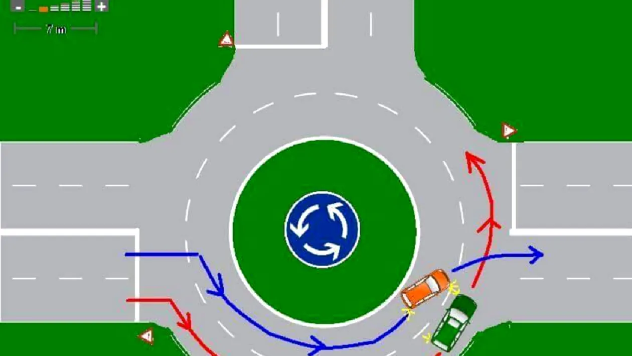 Conform graficului de mai sus, șoferul mașinii de culoare portocalie (linie albastră) e obligat să acorde prioritate mașinii de culoare verde (linia roșie). Fiindcă efectuează o schimbare de bandă pentru a ieși din sensul giratoriu, în timp ce mașina verde își păstrează banda.