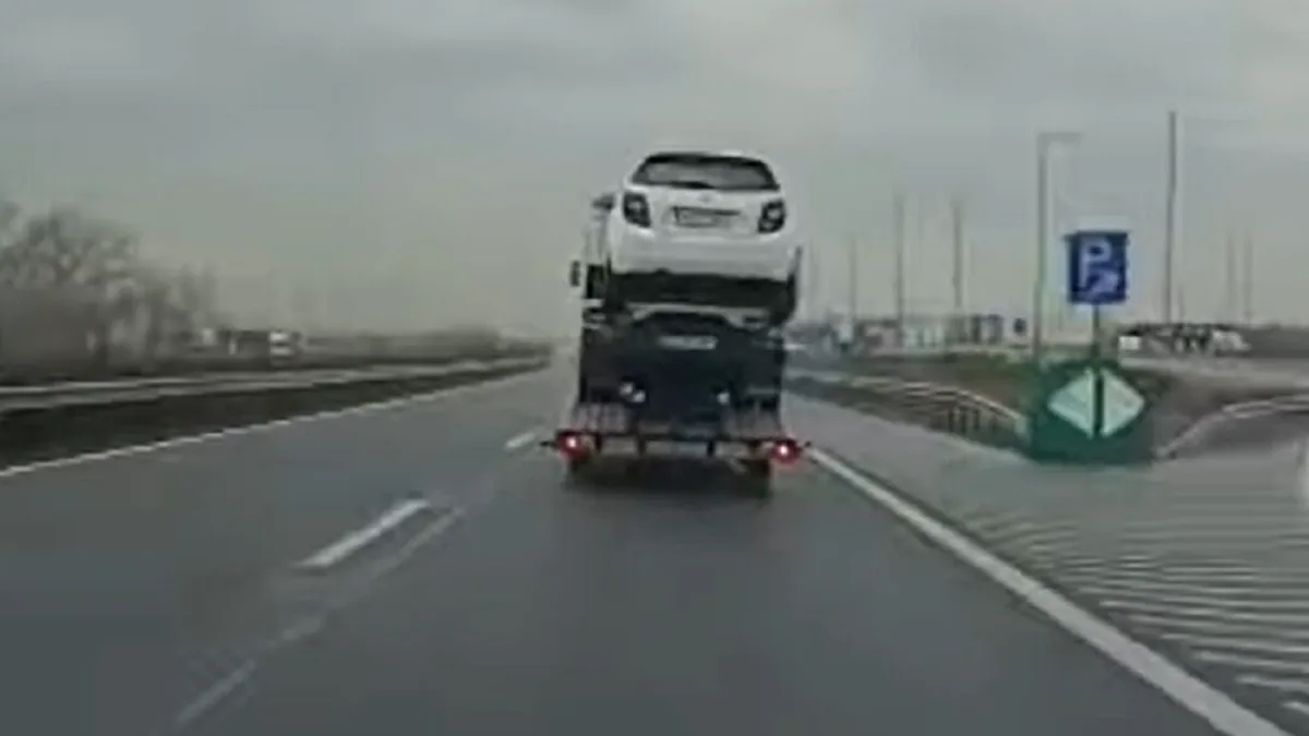 În imagini apare o autoutilitară înmatriculată în România, care tractează o remorcă. Pe platforma remorcii se află o camionetă, care, la rândul ei are încărcată pe platformă un autoturism.