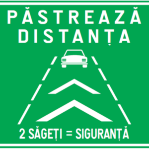 În partea de sus scrie „PĂSTREAZĂ DISTANȚA”, iar în partea de jos „2 SĂGEȚI = SIGURANȚĂ”.