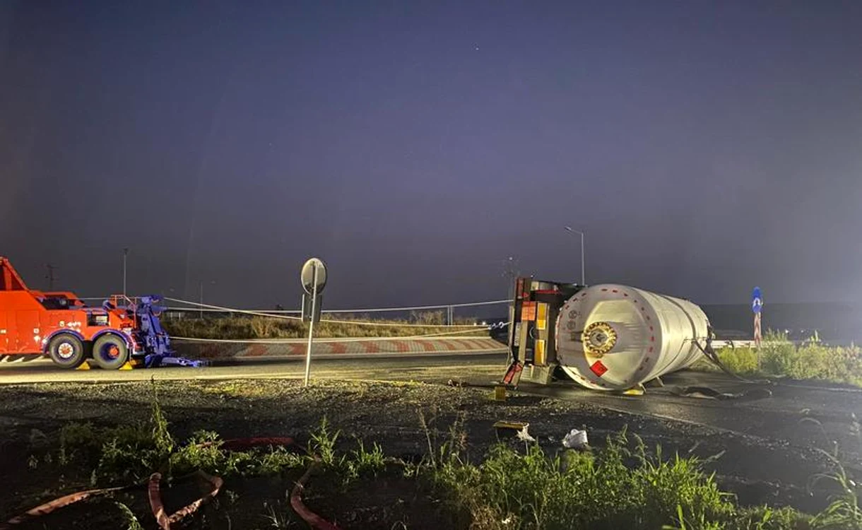 Cisterna cu gaz metan răsturnată la Vaslui, greu de repus pe roți FOTO: ISU Vaslui