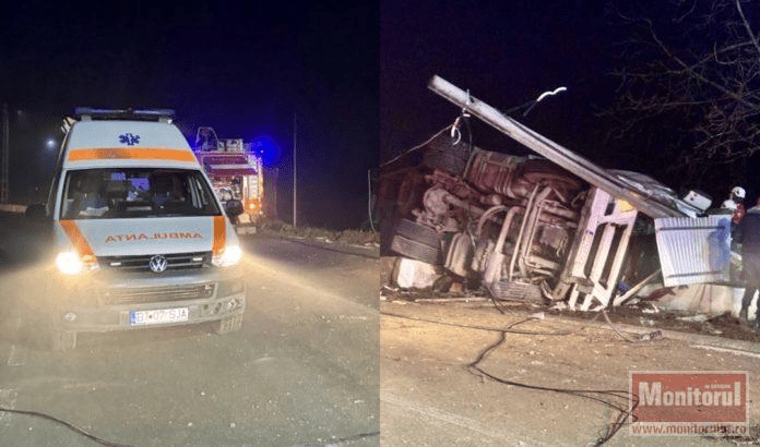 Accidentul cumplit a avut loc la 4 dimineața într-o curbă în zona localității Mesteacăn. Un camion încărcat cu cereale s-a răsturnat în curbă din cauza balansului încărcăturii. Mastodontul a lovit un cap de pod, apoi un stâlp de electricitate, după care s-a răsturnat pe o parte. Șoferul, un tânăr de 30 de ani, a fost prins în cabina strivită sub încărcătura camionului.