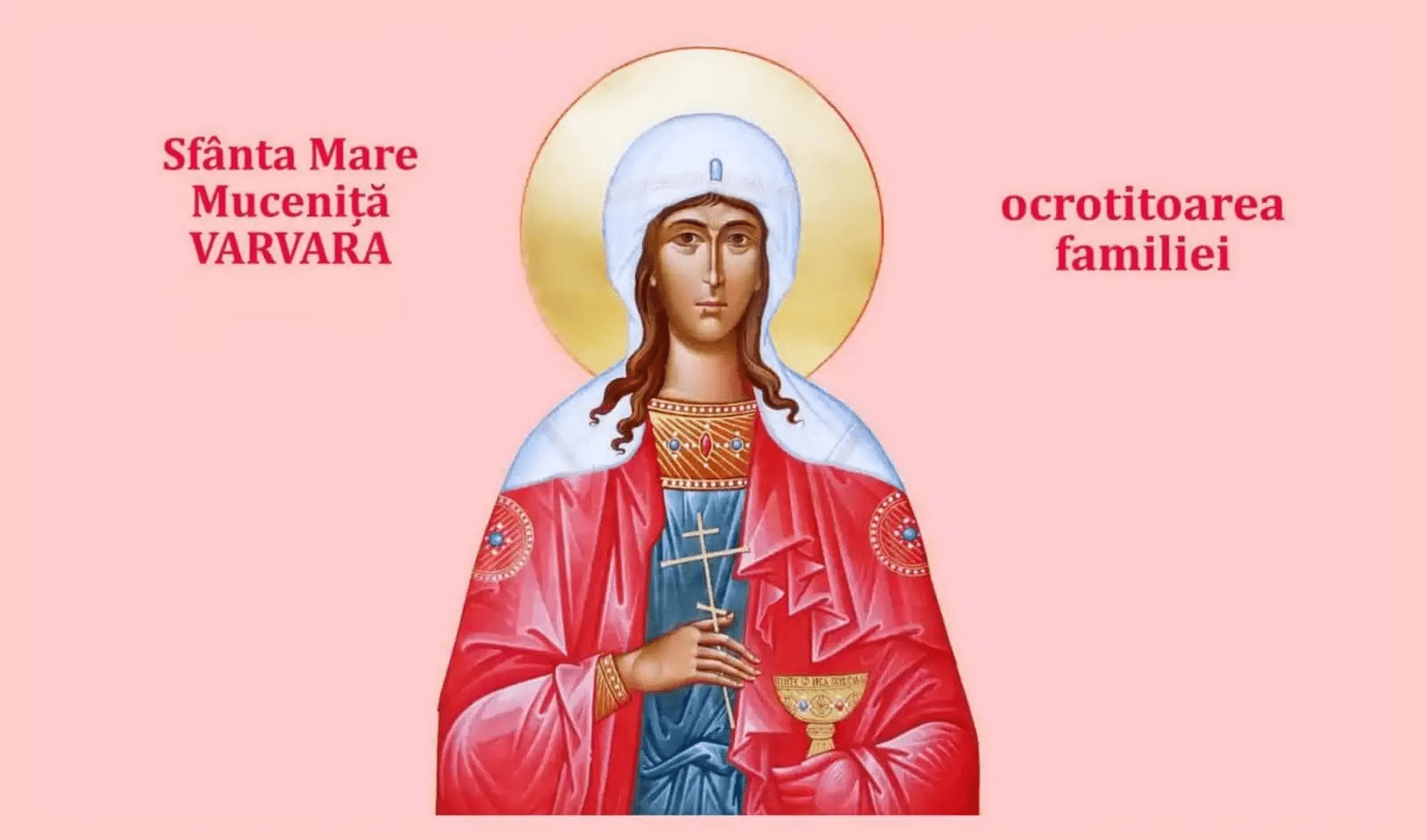 Sfânta Varvara a trăit în vremea împăratului Maximian (286-305), în cetatea Heliopolis (Egipt), fiind fiica unui dregător păgân cu numele Dioscor, care o ţinea sub pază, într-un turn înalt, din pricina marii ei frumuseţi trupeşti. Aceasta credea în Hristos şi n-a vrut să-şi ascundă credinţa de tatăl ei. Odată, când acesta a poruncit să se facă două ferestre la o baie pe care o zidea, fericita Varvara a cerut să se facă trei ferestre, în numele Tatălui şi al Fiului şi al Sfântului Duh. La auzul acestor cuvinte, tatăl ei s-a repezit să o omoare cu sabia, dar ea, fugind, a plecat şi s-a ascuns în munţi.