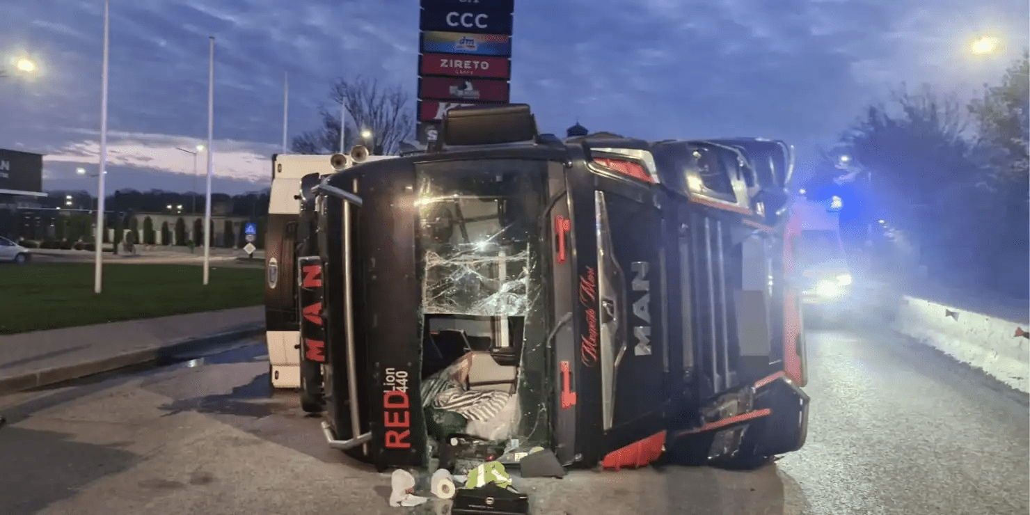 Un autotren în care se afla doar conducătorul auto a lovit un parapet, după care s-a răsturnat pe partea carosabilă. În urma impactului a fost acroșat și un alt autotren în care se afla doar conducătorul auto.