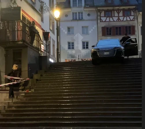 Mașina a rămas blocată pe treptele Primăriei Lucerna FOTO Blick.ch